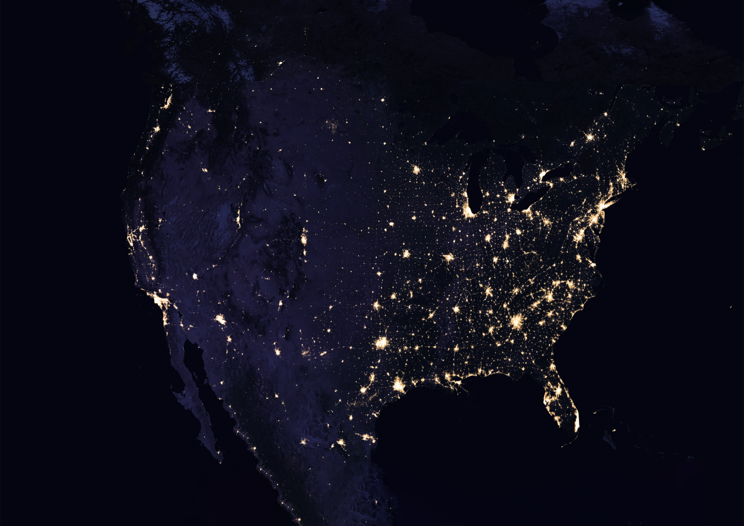 As its name implies, NASA’s Black Marble covers the whole planet. It’s a powerful image, rendering the simile of cities as stars in the night sky almost literal—as above, so below. Civilization radiates light. If we could see this image in time lapse over the past few centuries, we’d indeed witness cities “ignite” as their populations coalesce, first very faintly with firelight, then with gaslight, then much more brightly with electrification. 15