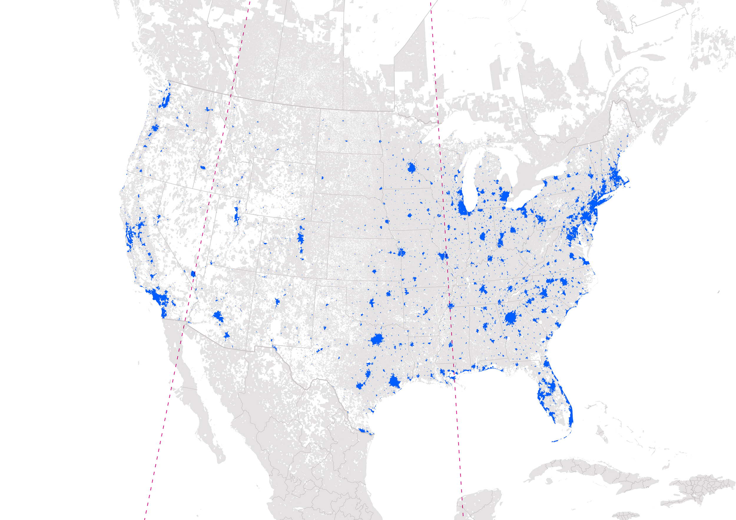 The 62.7% cutoff is arbitrary, but for now, think of the colored-in ZIP codes as “urban,” and the others as “rural”; I’ll soon quantify the excluded middle of this binary—the suburbs. (White areas, mostly representing mountainous and wild terrain where there are no mail delivery routes, have—at least officially—no permanent population.) The resulting density map looks a lot like NASA’s “Black Marble,” the Earth as imaged by satellite at night, since terrestrial light sources and cities generally coincide.