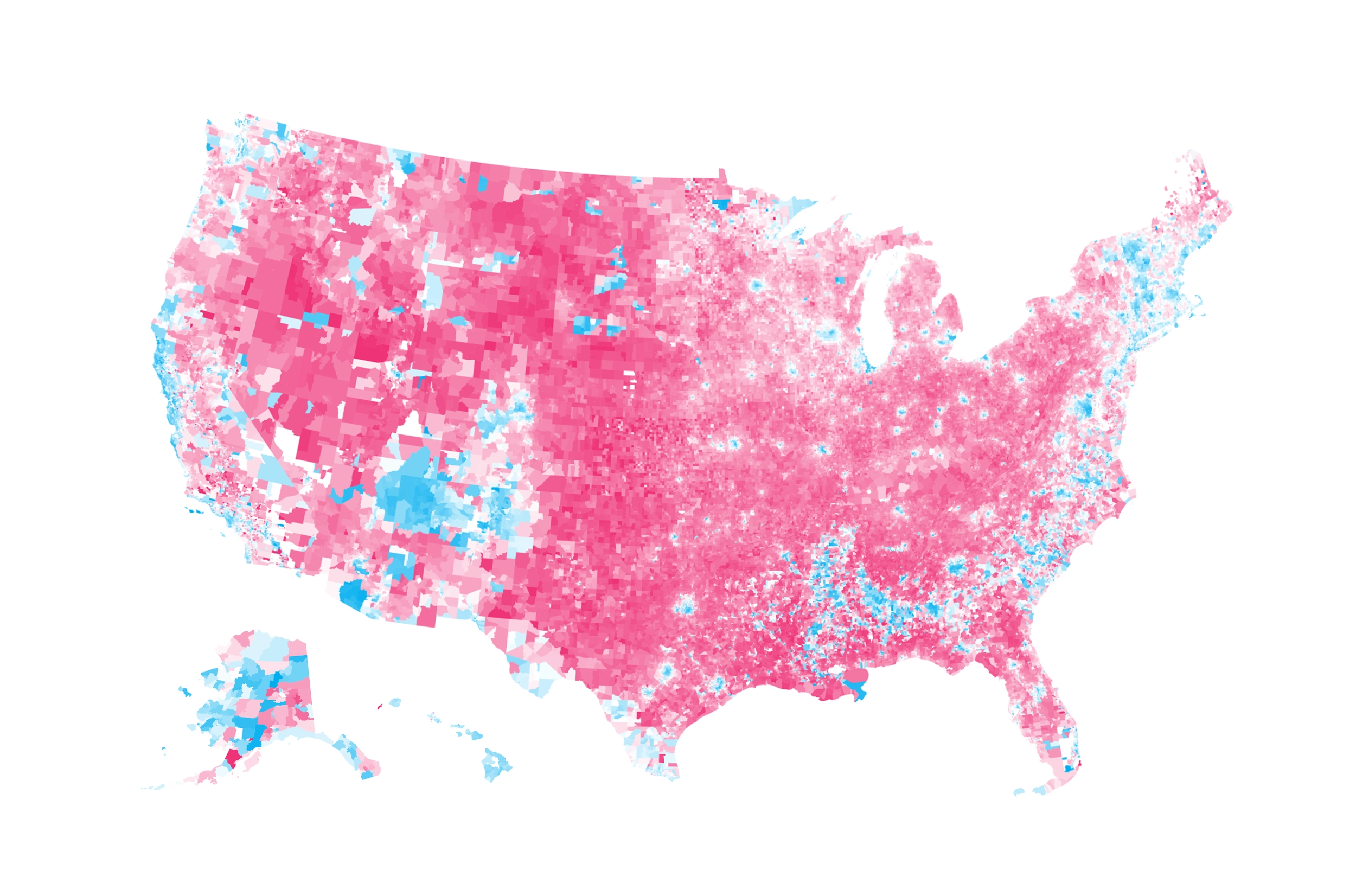 By land area, the country looks “red,” as seen in now-familiar voting maps that color in precincts based on their popular vote. However, by population count, the US has already tipped decisively to “blue.” The precinct-level voting map looks the way it does—overwhelmingly red by area—precisely because of the combined effects of intensive urbanization and political sorting by population density.
