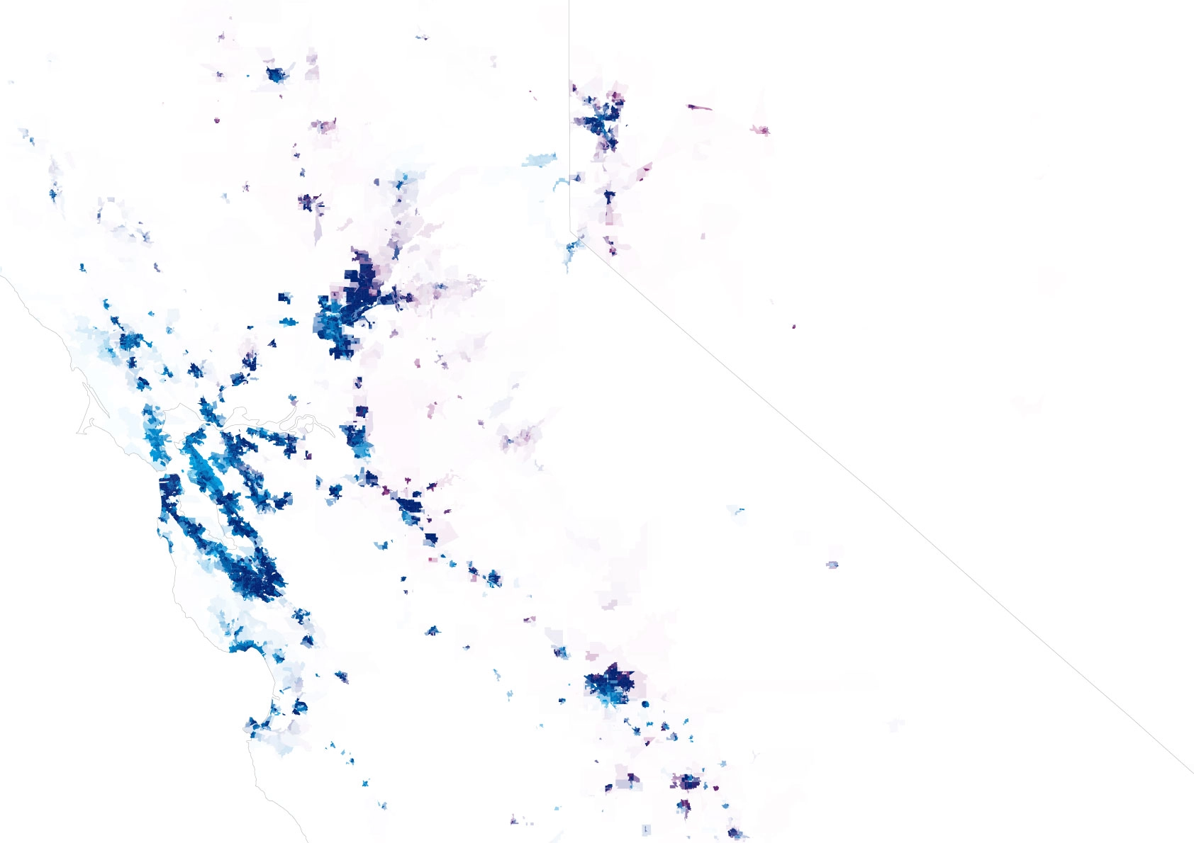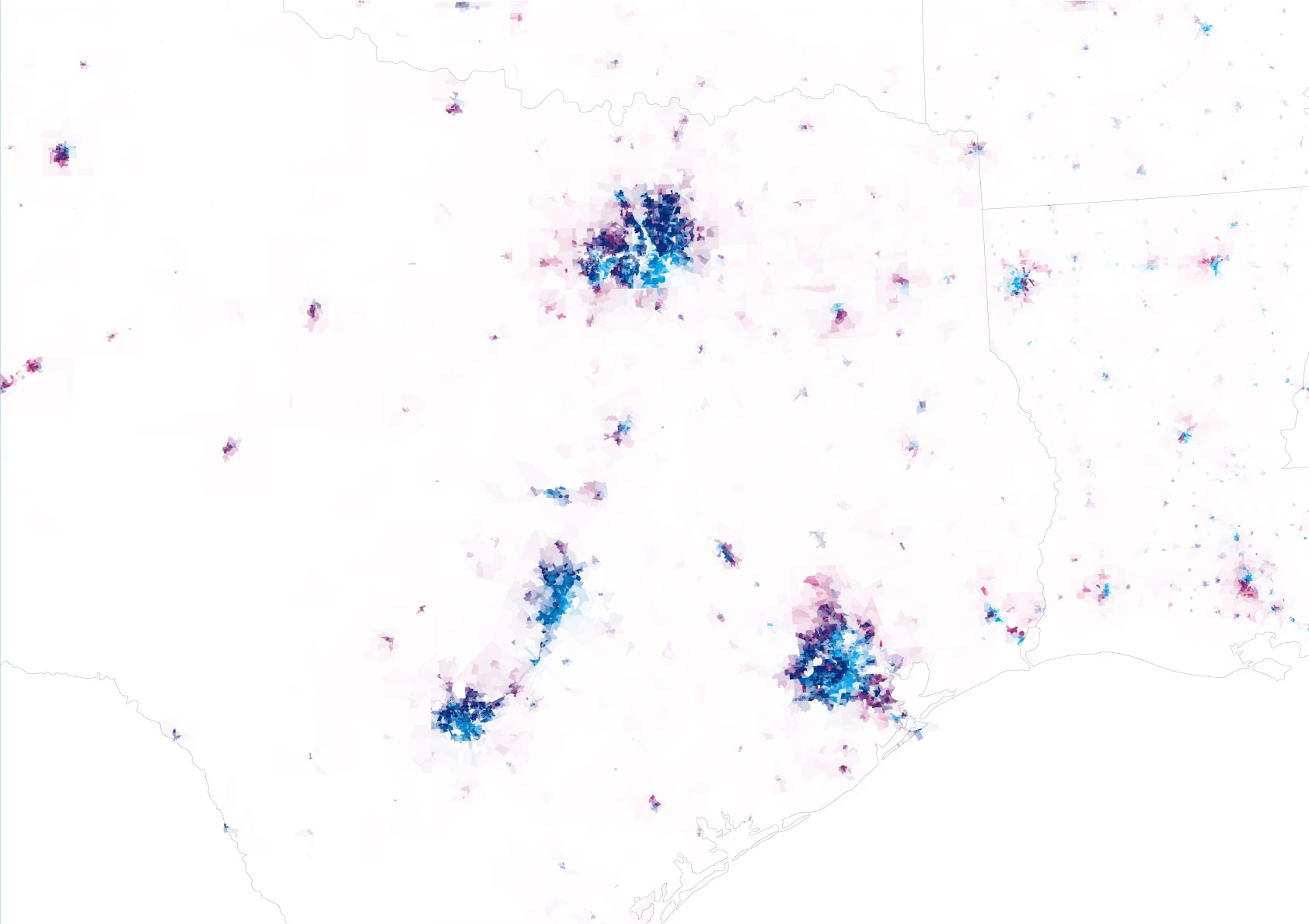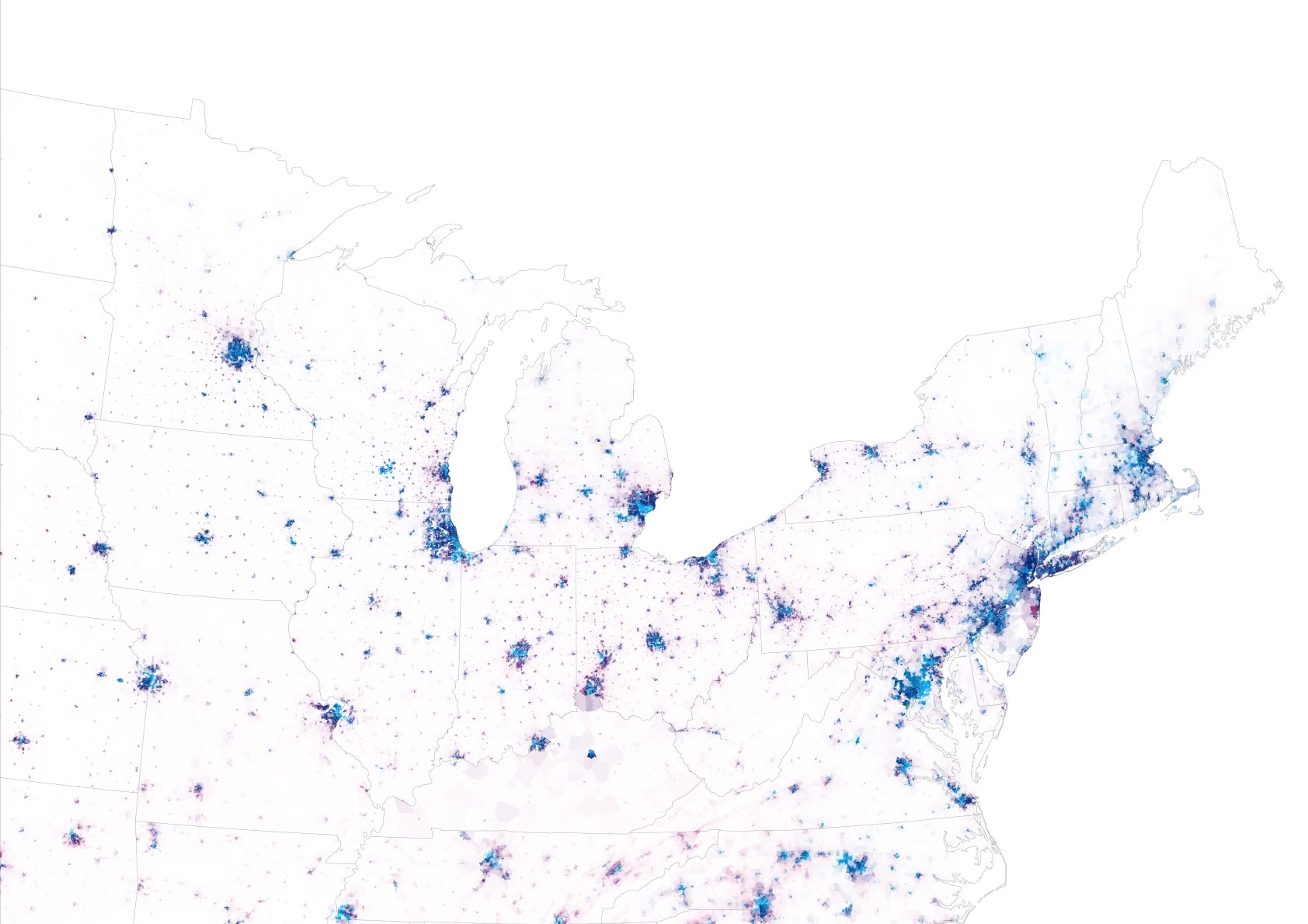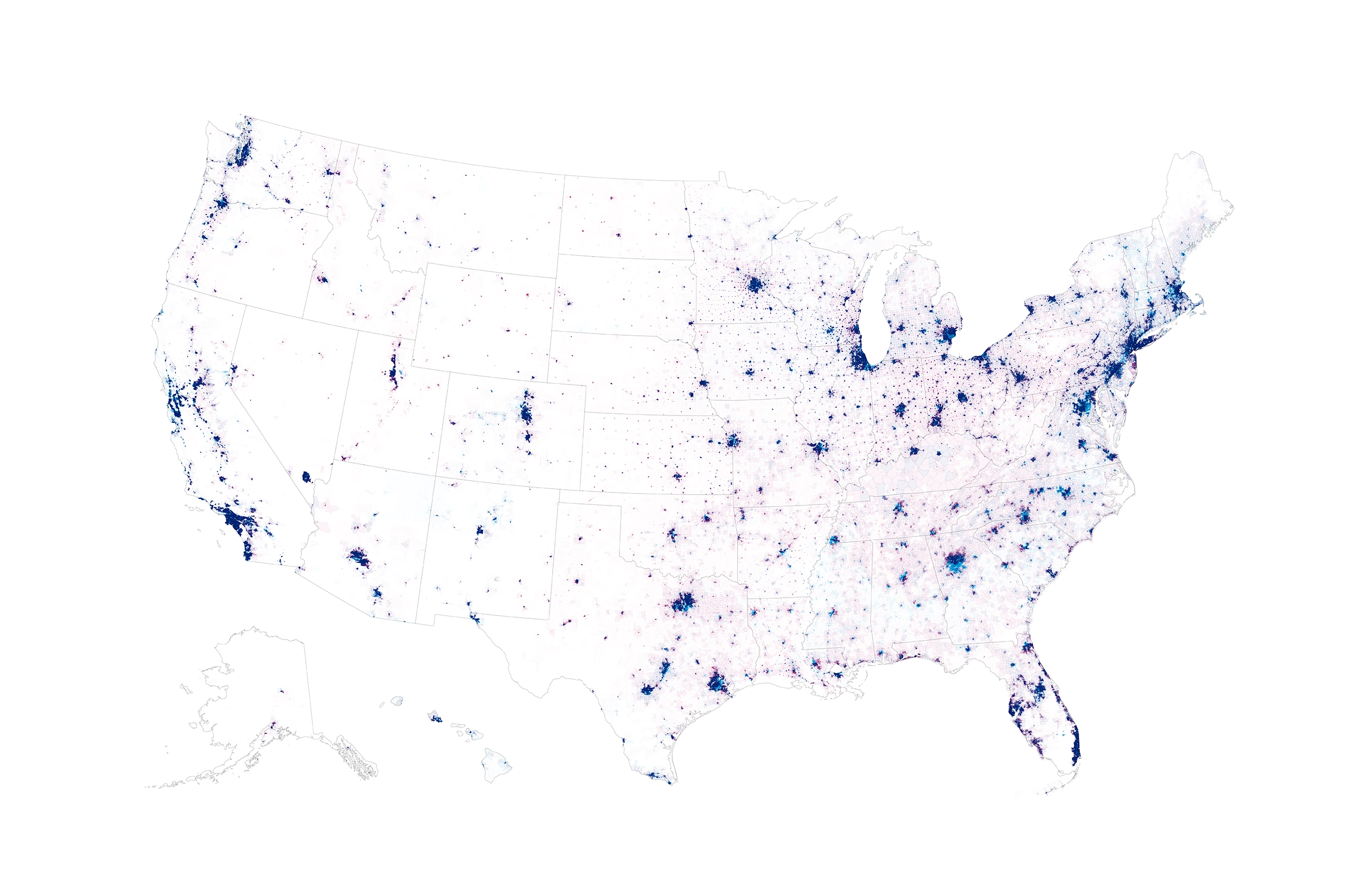 Arguably, a more informative way to visualize voting is to divide Democratic and Republican precinct votes by area. This is a more faithful rendition of the popular vote—approximating the pointillist image we’d see if every person were represented by a tiny red or blue dot. 23 Red and blue votes can be visualized separately, or overlaid to form a single image, with the two colors mixing to produce purple in the most contested areas. Although both red and blue votes are scarce in the deep countryside (because people are!), red votes are comparatively far more common in rural places, giving them a diffuse red hue—as is especially evident east of the Mississippi, where more of the countryside is settled. Major cities, though, are invariably more blue than red, whether they’re on the East or West Coast, in the Midwest or in Texas. Small towns are typically much redder, though, with occasional exceptions like Ithaca, New York (not coincidentally, home to Cornell University).